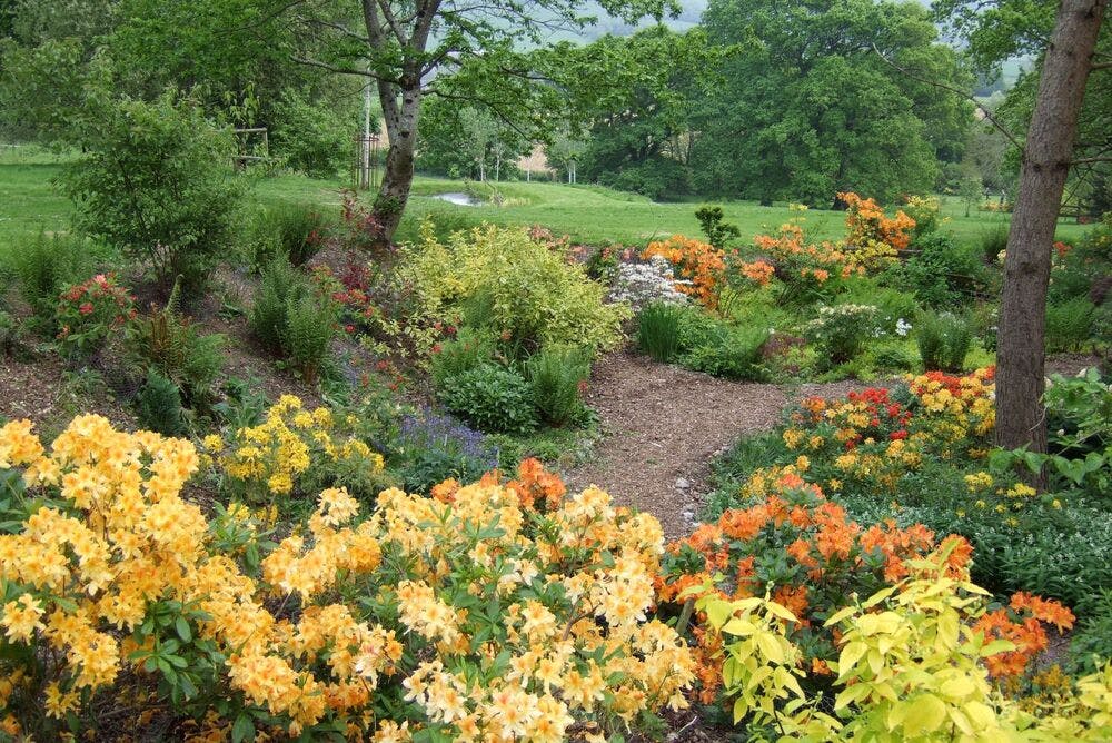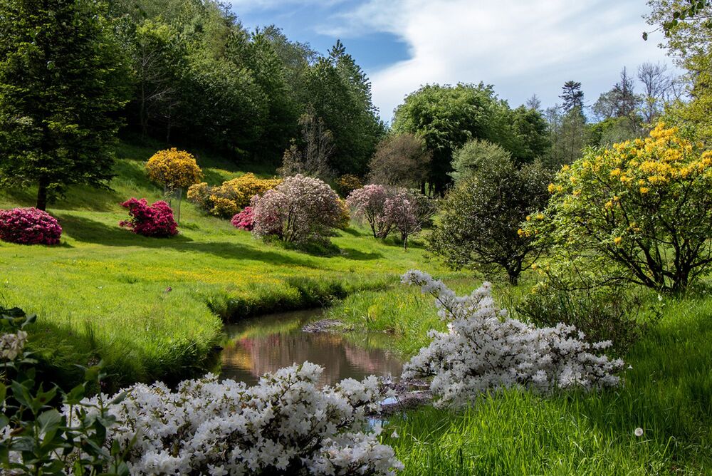 This time of year, the woodland garden is ablaze with colour from azaleas and rhododendrons, anemones and bluebells carpet the floor. The first flush of alliums are swinging their pompoms in the Hot Garden, the Wildflower Meadows are full of buttercups, ox-eye daisies and orchids, tulips are showing their beauty in the Cottage Garden, the orchard is frothy with apple blossom, and the Stream Garden is lush with the acid green of ferns and the vivid blue of camassia.
