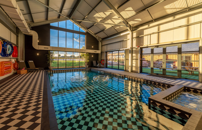 Luxury timber-clad holiday lodge in Somerset sleeping 12 in 6 ensuite bedrooms, with 2 more beds available at an extra charge per person. There’s a private indoor pool, sauna and games room, hot tub, Nordic style BBQ lodge and children’s play equipment. 2 cots (age 2 yrs and under). 2 dogs welcome (small charge per pet).