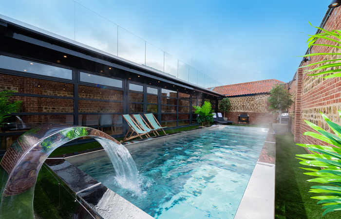 Stunning contemporary holiday house near Bath sleeping with room for 4 more guests at no extra charge. There’s a year-round outdoor pool with a striking stainless steel slide and swim up bar, a hot tub, steam room, sauna, outdoor kitchen, games room/gym, cinema room, and children’s play area. Other features include a 6m waterfall in the hall, an ornate bespoke staircase and a 24 carat gold leaf hammock bath. 2 cots (age 2 yrs and under). 2 dogs at a small charge per pet.