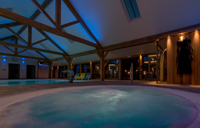 Large and luxurious barn conversion in Somerset sleeping 20 in 10 ensuite bedrooms, +10 more guests at an extra charge per person. Stunning private spa hall with indoor pool, hot tub and sauna. Games room, BBQ lodge and play equipment. 3 full-size cots and 3 travel cots available (age 2 yrs and under). 2 dogs welcome (small charge per pet).