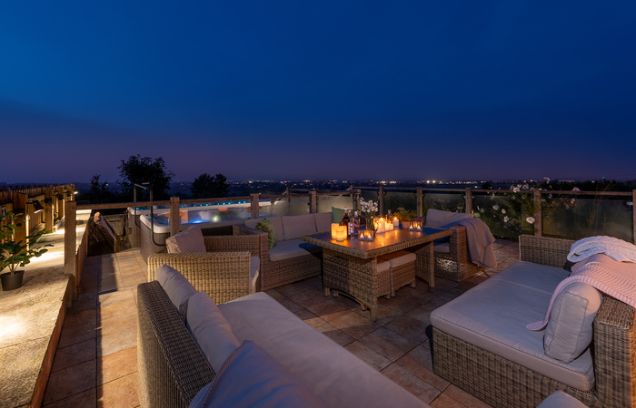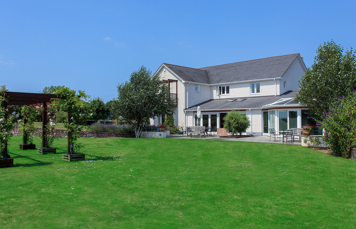 Tip-Top is a luxurious contemporary house in a secluded setting in the Devon hills. Sleeps 10 in 5 ensuite bedrooms, with room for 2 extra guests at no charge. Outside there’s a 4m swim spa, a BBQ lodge, outdoor table tennis, trampoline and play area, firepit and pizza oven. 2 cots (age 2 yrs and under). Sorry, no pets. NB: Due to planning restrictions this property is only available to family groups.