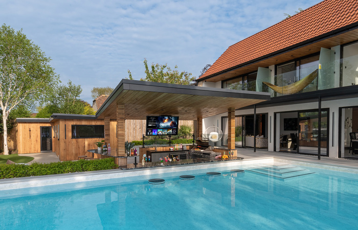 Contemporary holiday house in Wiltshire, not far from Bath. Sleeps 12 in 6 ensuite bedrooms, with room for 4 more guests at an extra charge per person. Year-round outdoor heated pool, games room and outdoor cinema. Private walled garden and roof terrace. 2 cots (age 2 yrs and under). 2 dogs welcome (small charge per pet).