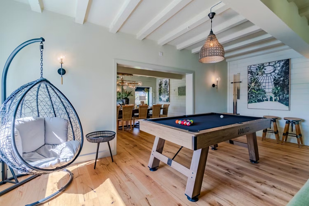 Idle the days away making the most of the amazing features – a hot tub, a games room/living room with a pool table and table football, outdoor table tennis, an outdoor kitchen and pizza oven, and your very own Wonky Bar with a juke box you can stream your music to.