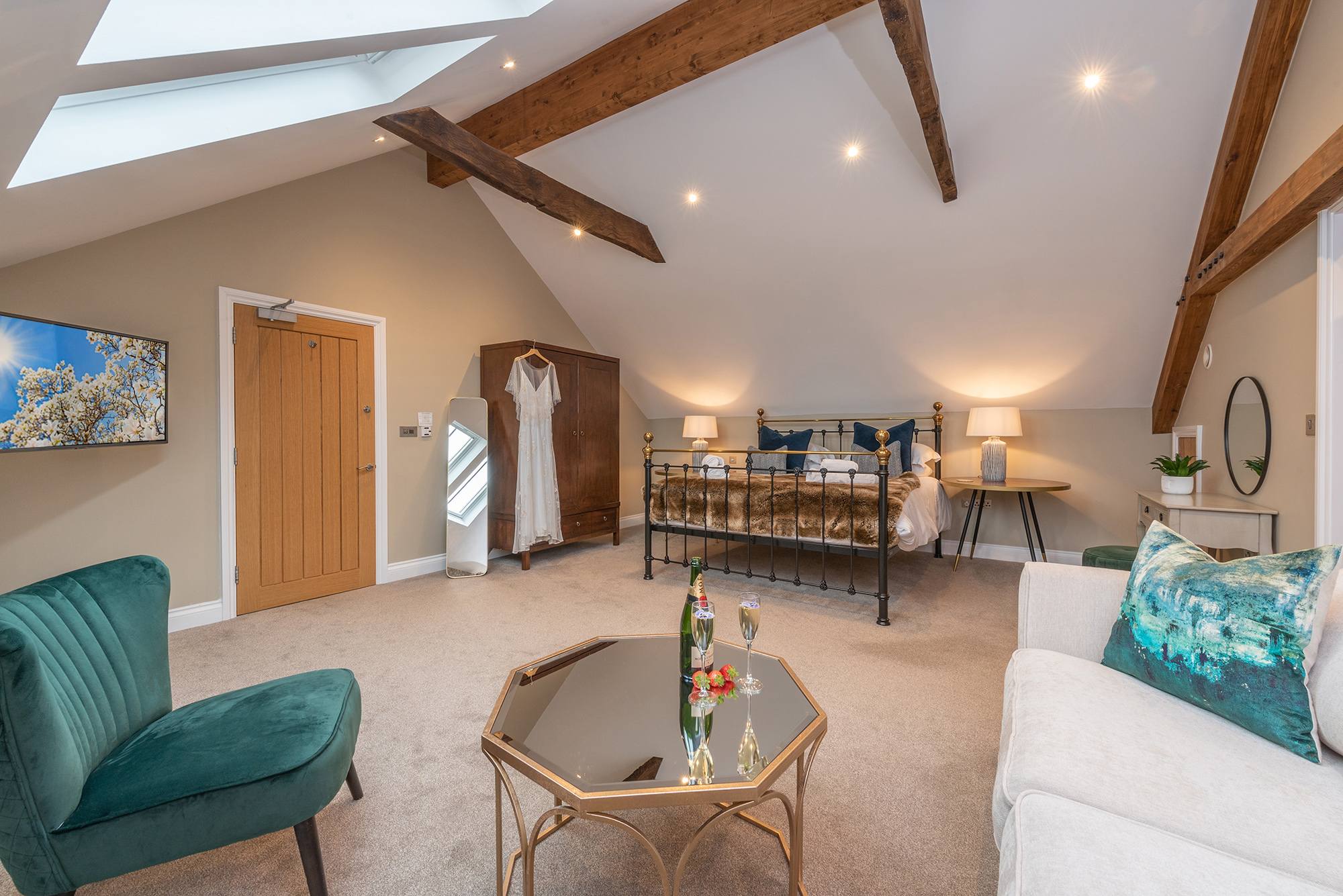 A second floor room with a super king bed and an ensuite bathroom with a free standing bath and walk-in shower.