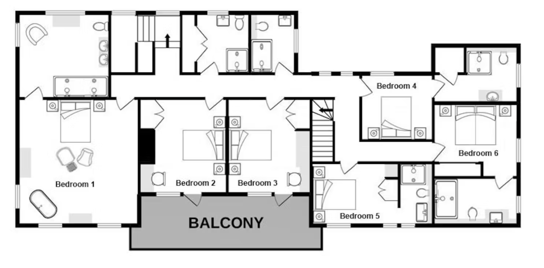 First floor room in the main house, king size bed, doors to balcony shared with Bedroom 2, own shower room just across the landing.
