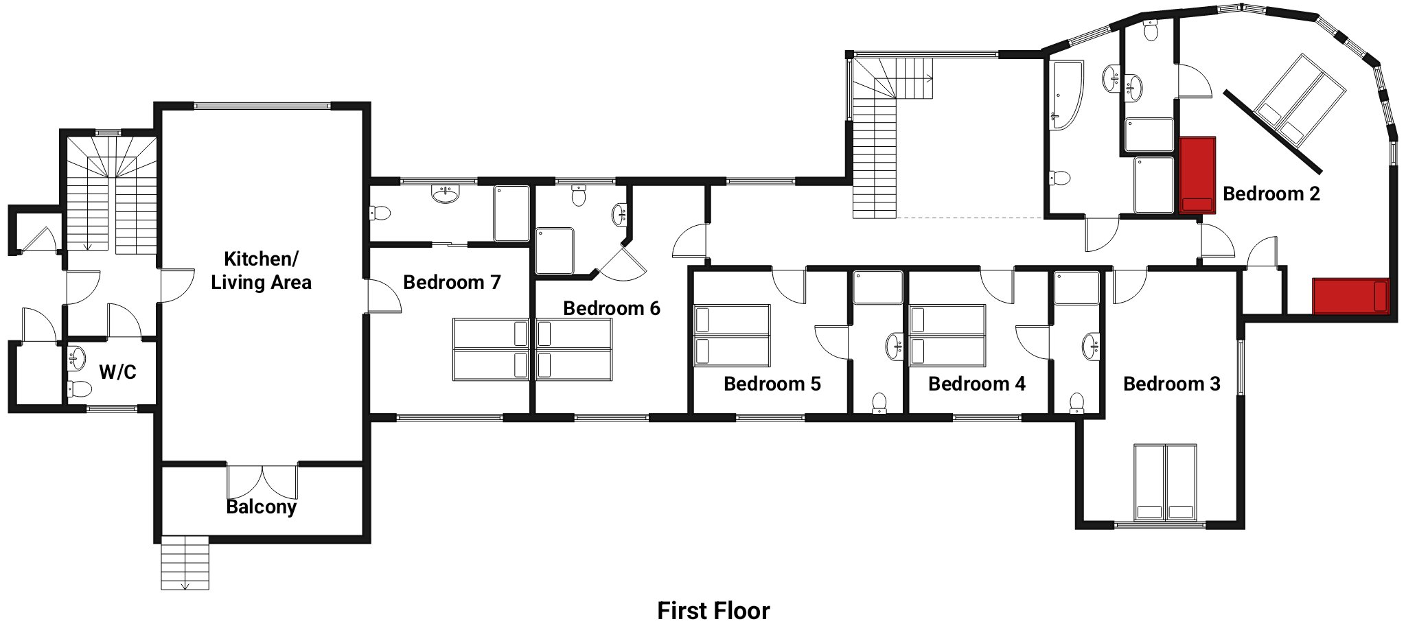 Ground floor House 2, 3 ft single bed, shares family bathroom with Bedroom 9.