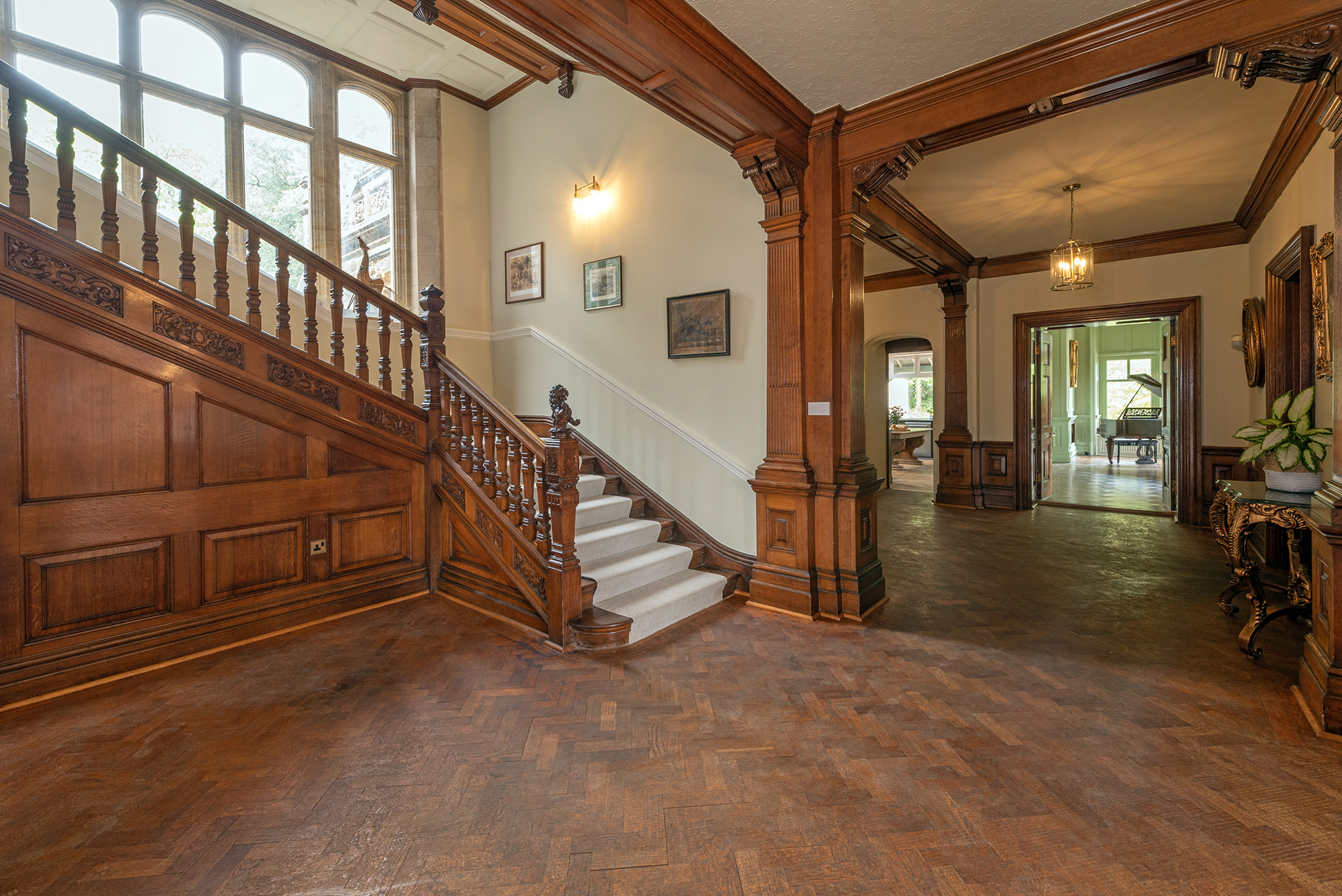Kennard Hall - The wide hall has original parquet flooring and wood panelling -