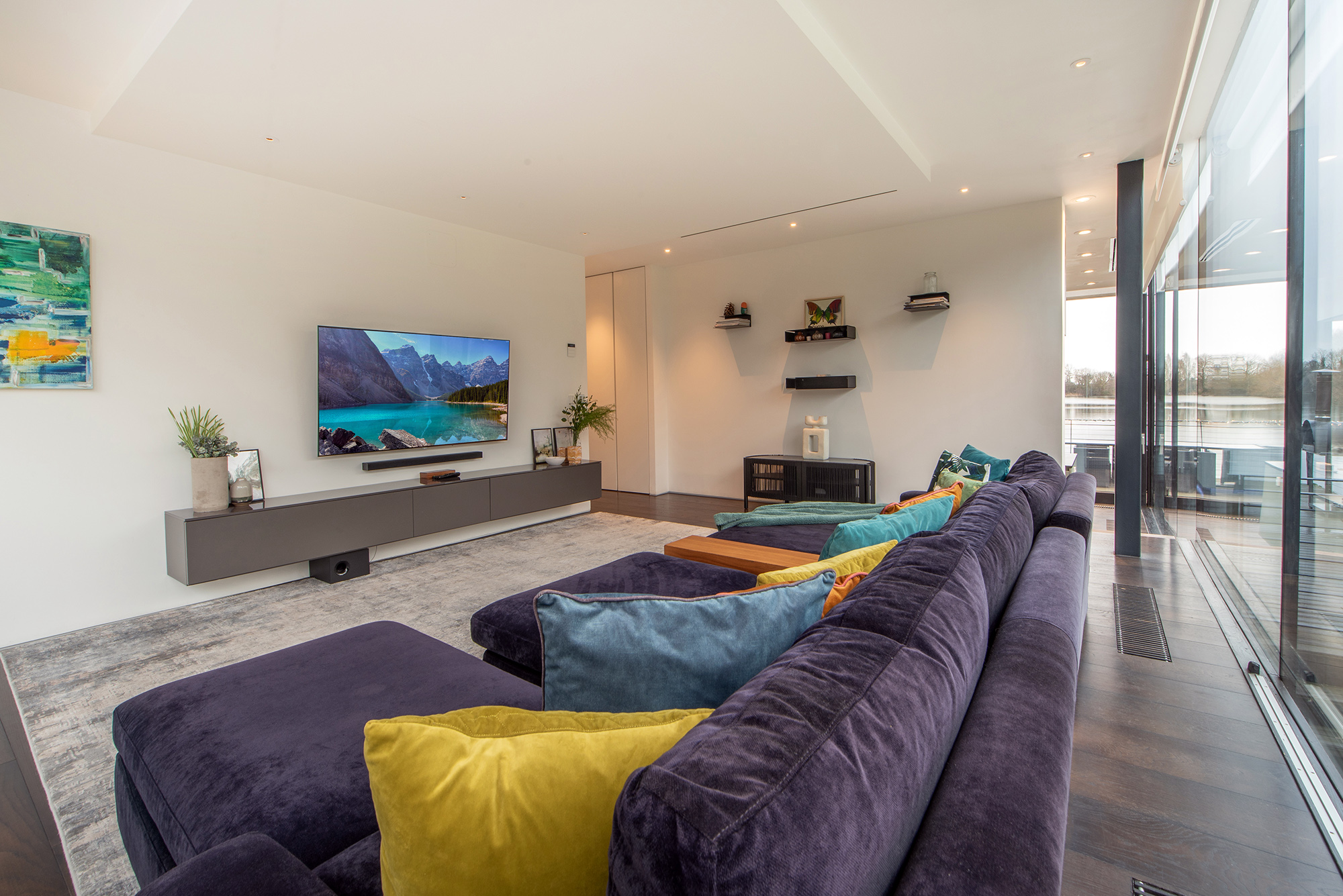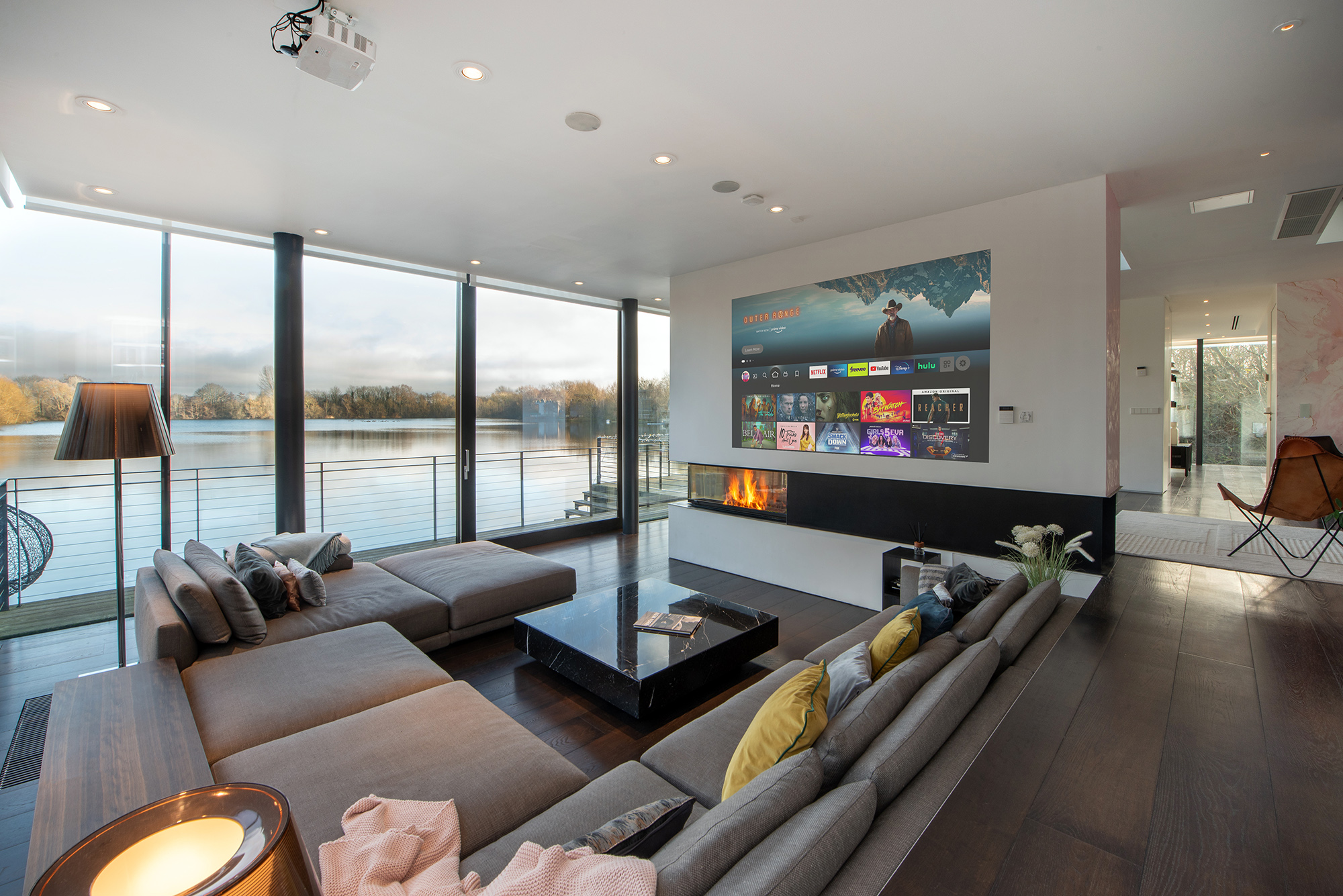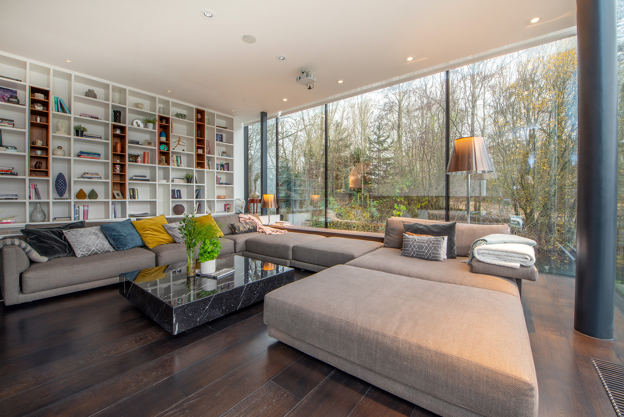 The Glass House - The living room; sunken sofas, a projection wall, stunning views -
