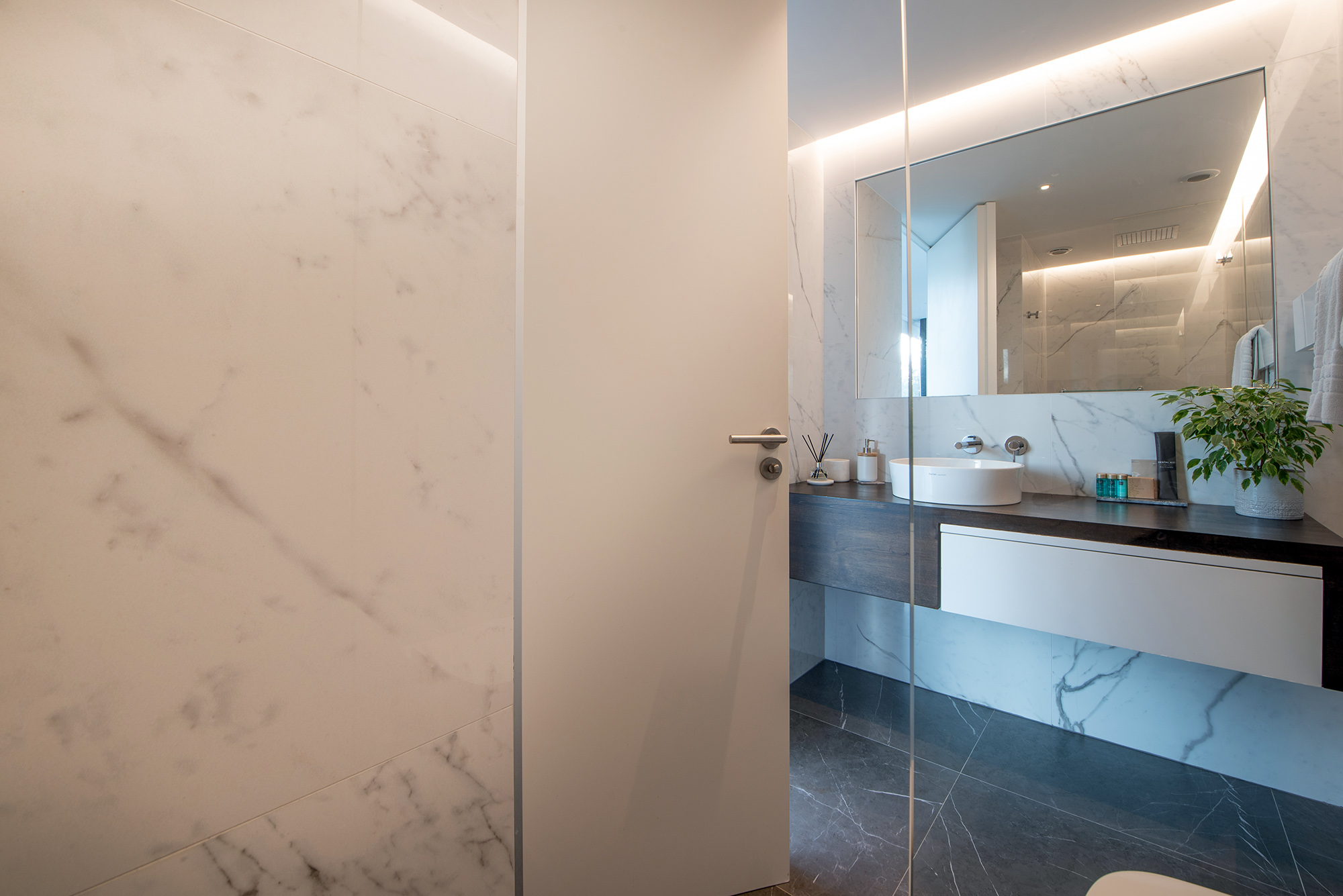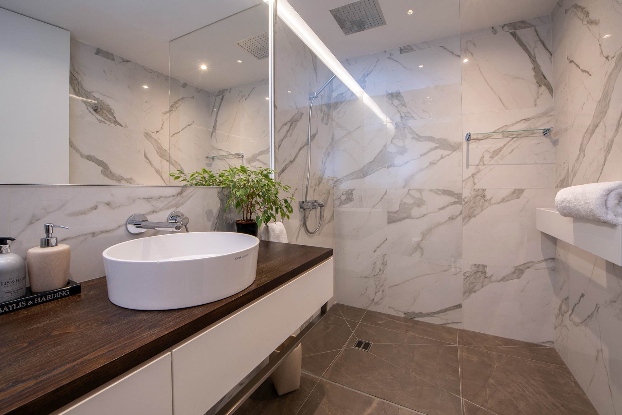The Glass House - The white marble wet room to Bedroom 4, on the ground floor -