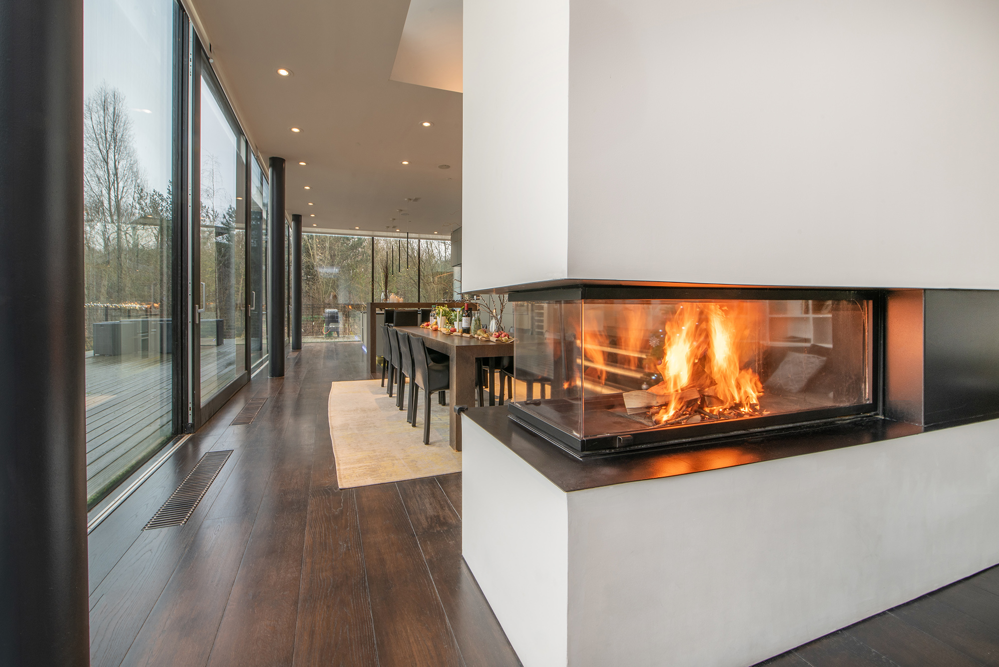The Glass House - A glass walled wood-burner separates the dining and living areas -