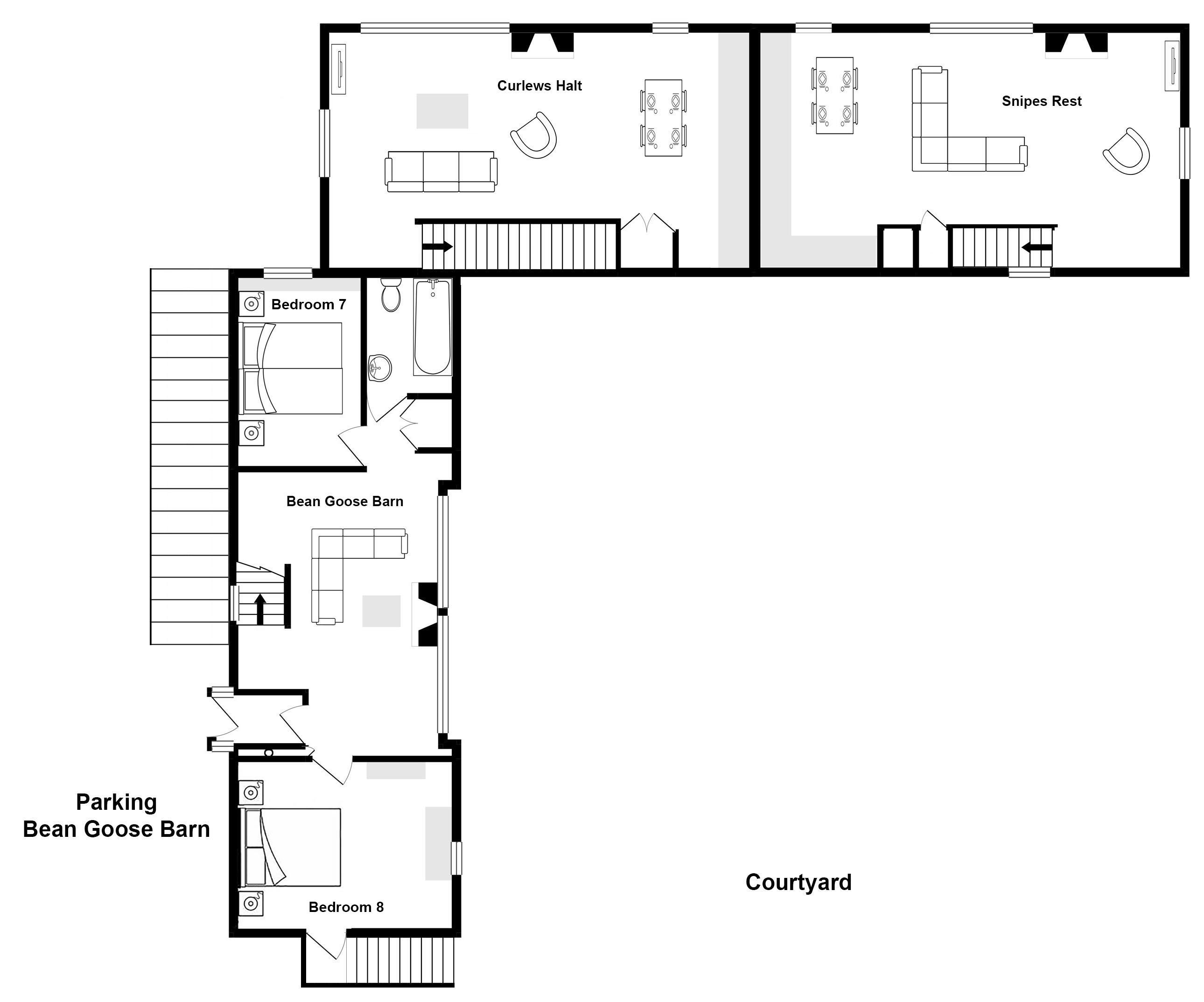 Bedroom 8 is in Bean Goose Barn, on the first floor. It has a king size bed and use of the bathroom just the other side of the sitting room. From this room there is a door and steps leading down to the garden. Sleeps 2.
