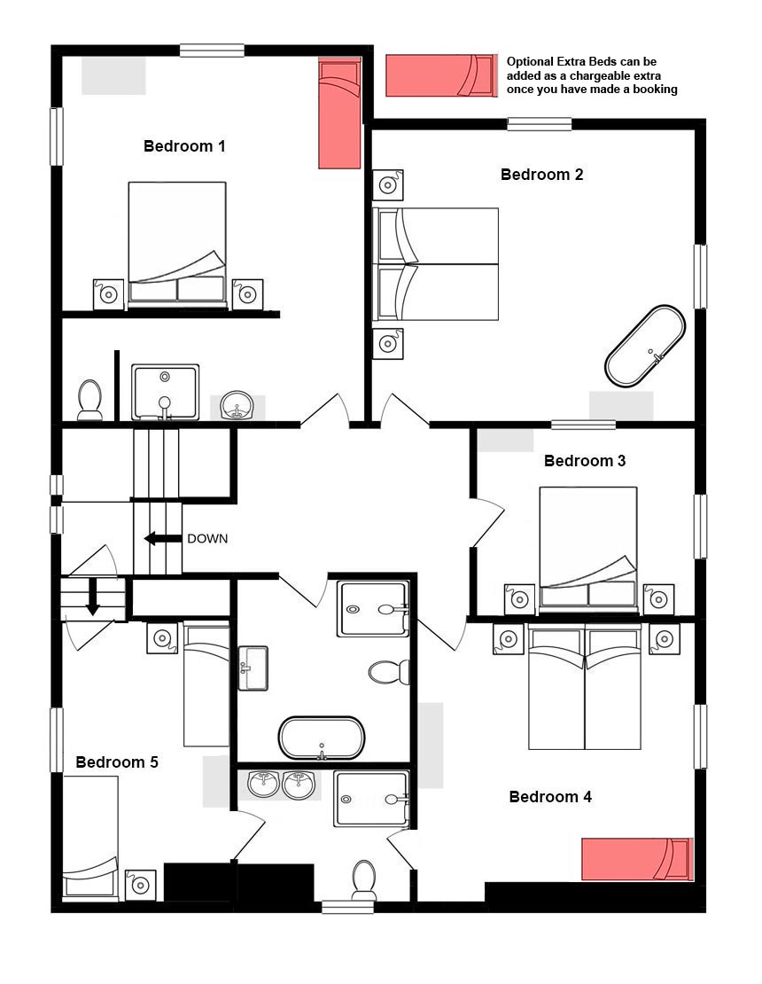 A first floor room with zip and link beds (super king or twin) and a Jack and Jill shower room shared with Bedroom 5.