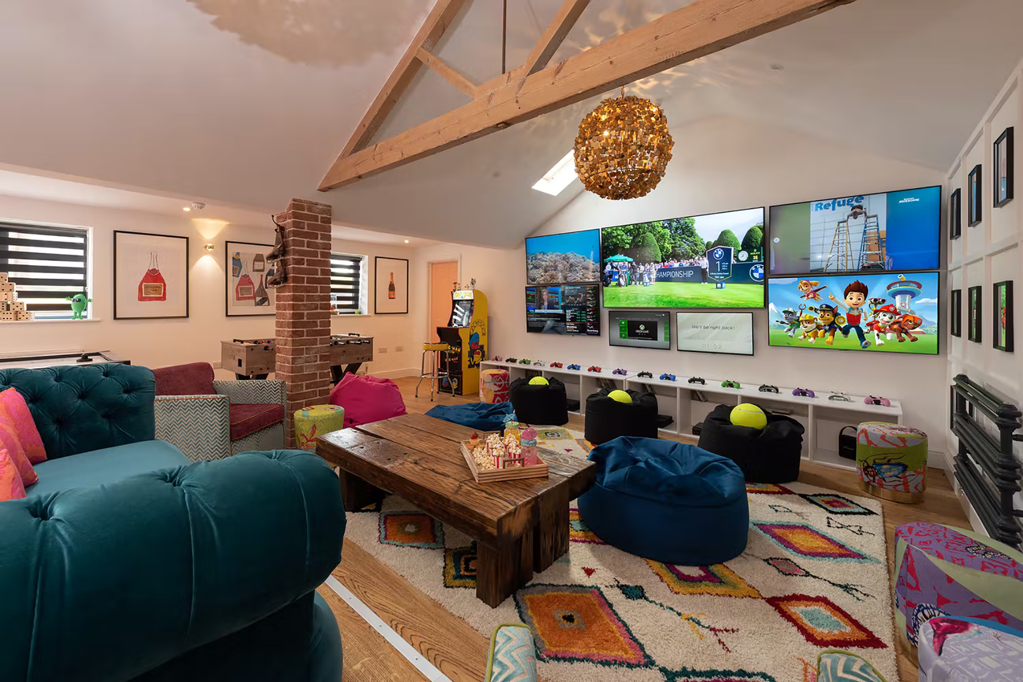 Zippity - The games room has an immersive TV wall with 7 screens -